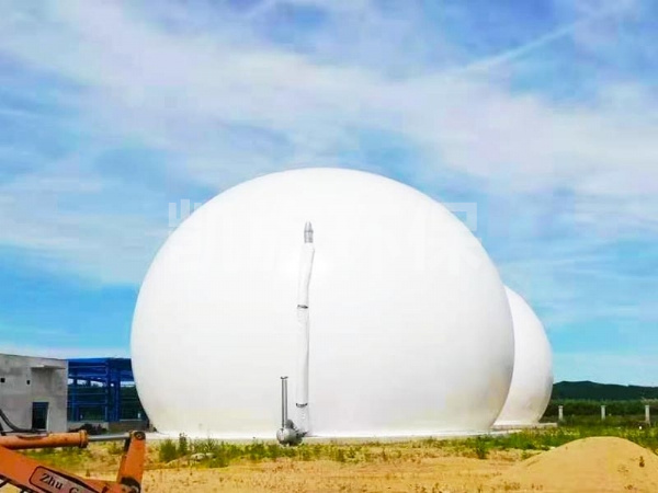 雙層膜沼氣罐外型為3/4球體,由鋼軌固定于水泥基座或厭氧罐罐頂上。主體由特殊加工聚酯材質制成,罐體由外膜、內膜、底膜(地上柜)及附屬設備組成,具有抗紫外線及種微生物的能力,高度防火并符合標準。